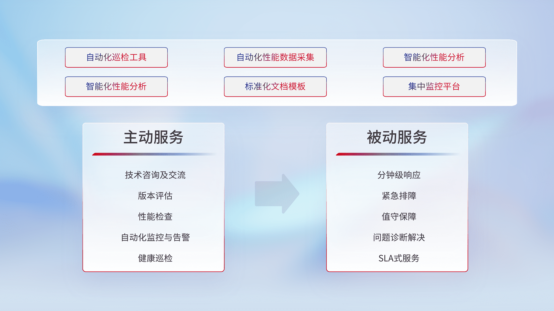 智能化工具和标准化文档,,保障服务质量,,,,提供主动服务(包含技术咨询、、版本评估、、、性能检查、、自动化监控与告警、、、健康巡检)和被动服务包含(分钟级响应、、紧急排障、、、值守保障、、、、问题诊断解决、、、SLA服务)。。。。