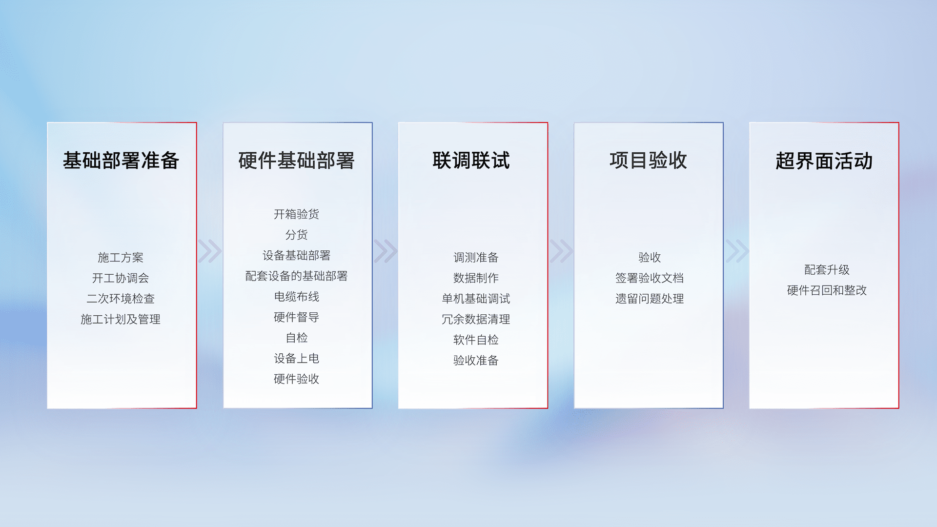 从基础部署准备、、、、硬件基础部署、、、联调联试、、、、项目验收、、、越界面活动的全过程可追溯,,,,保证施工质量和进度。。。。